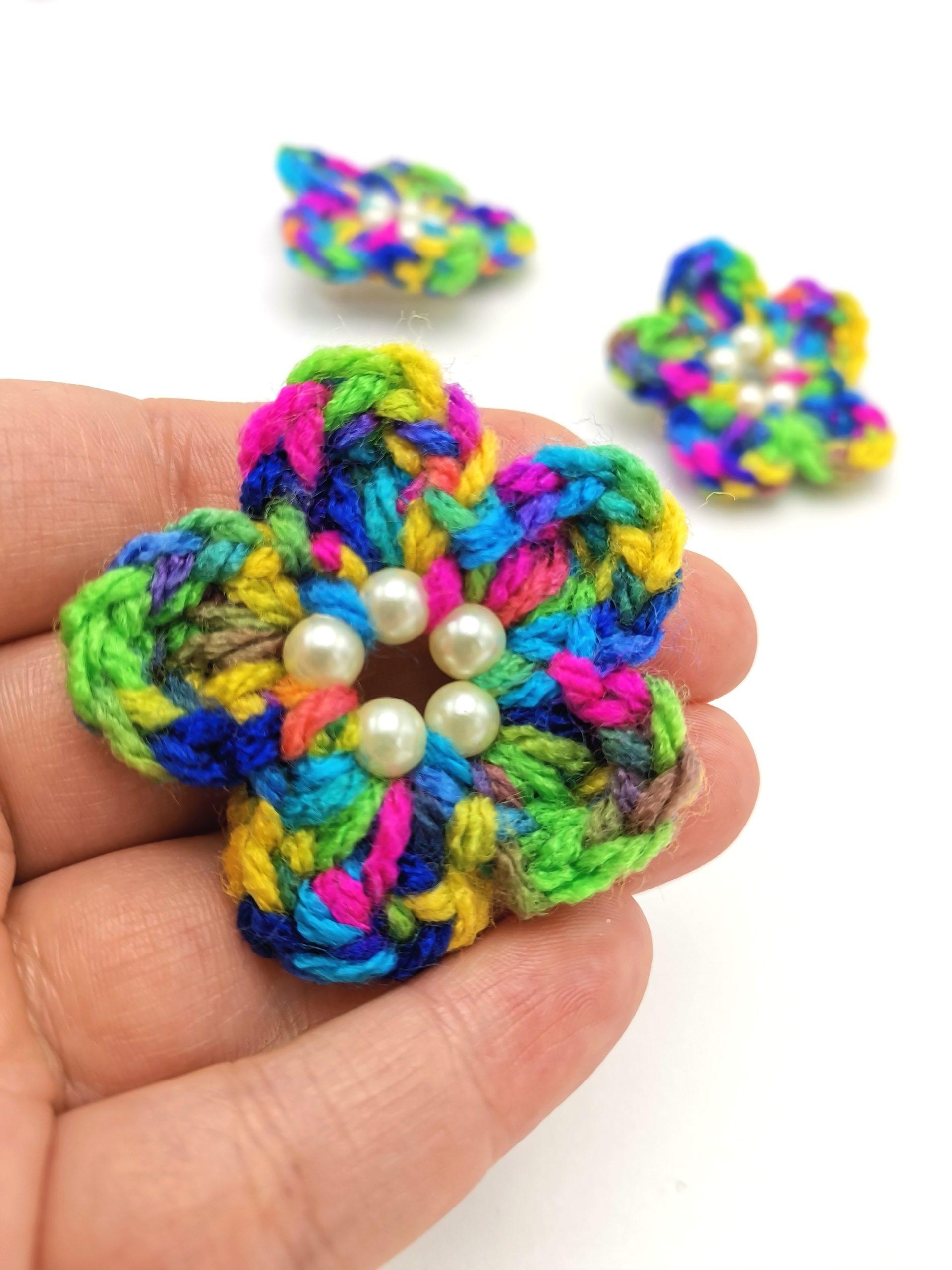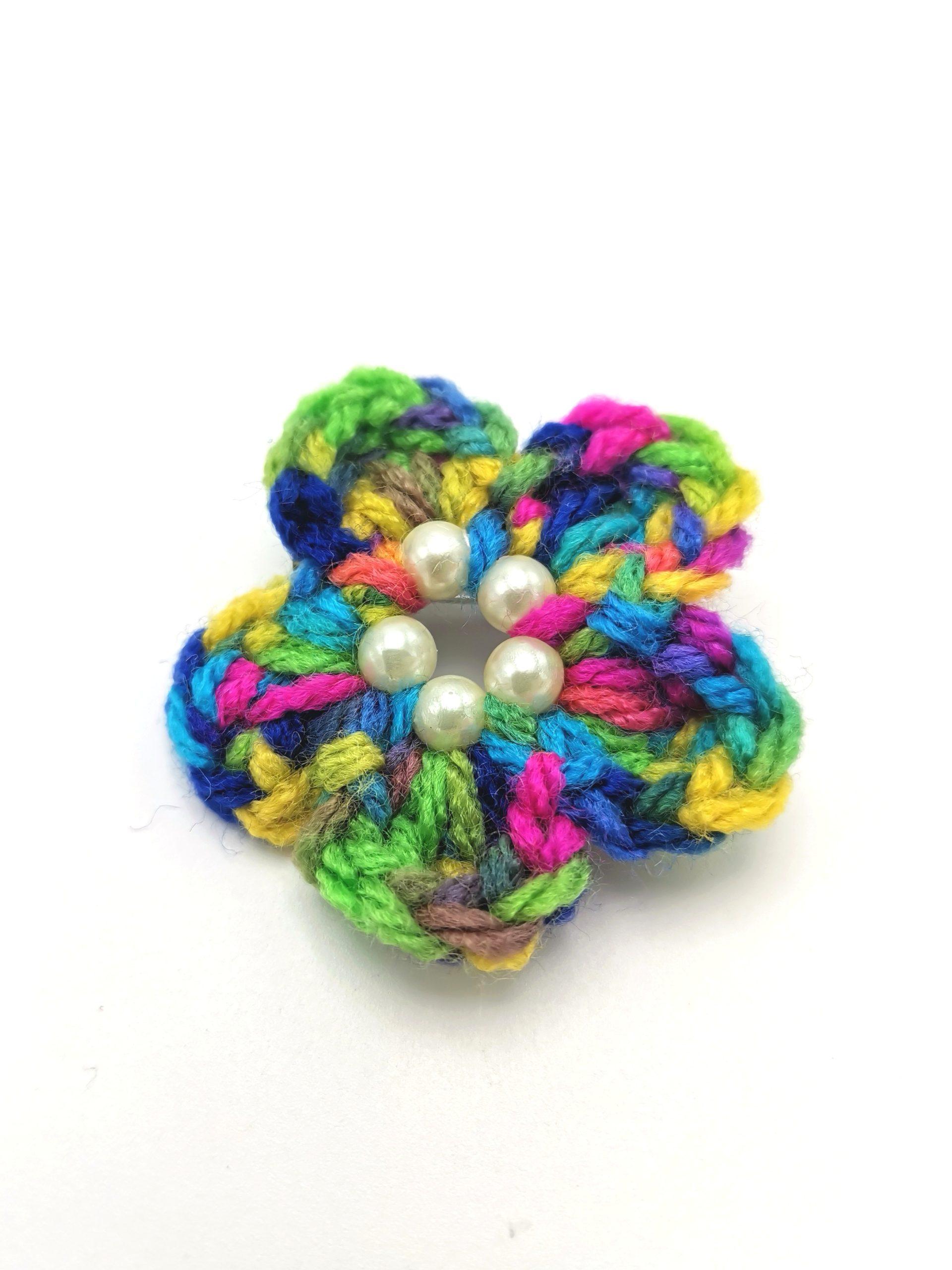 Brosa model floare crosetata manual din fir multicolor