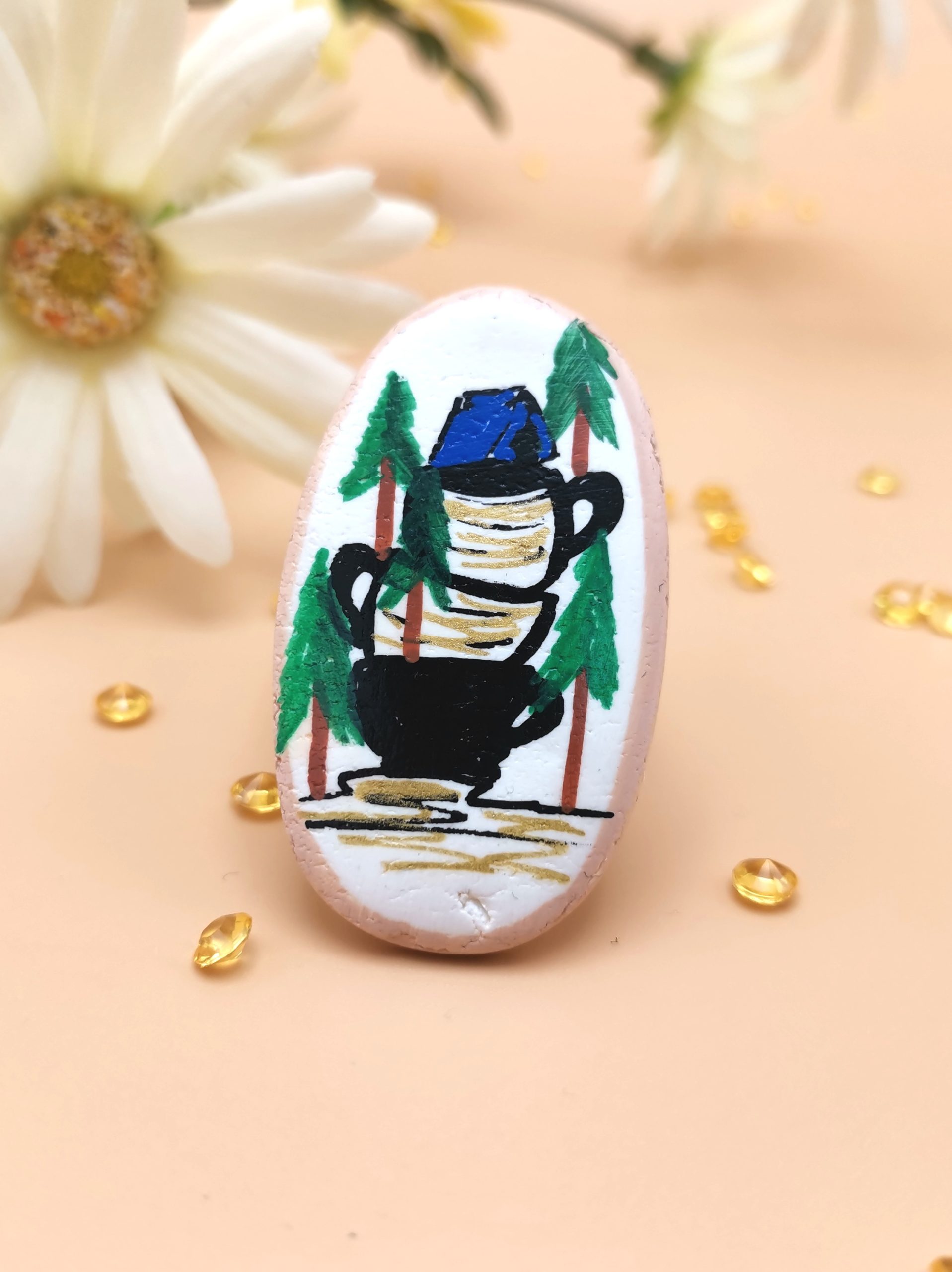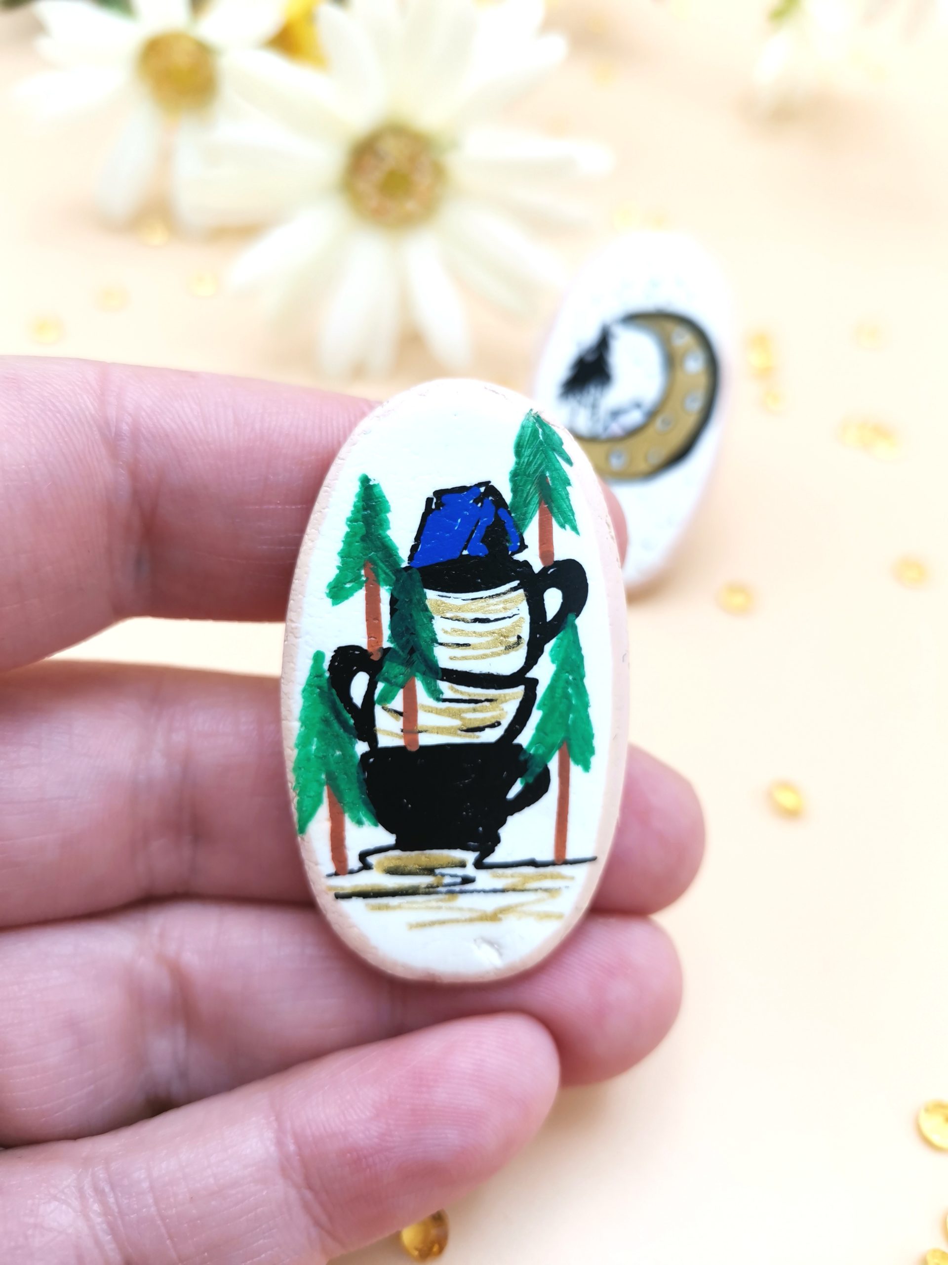 Brosa martisor cu cortul pe munte , desenata in culori acrilice pe o baza din portelan rece.