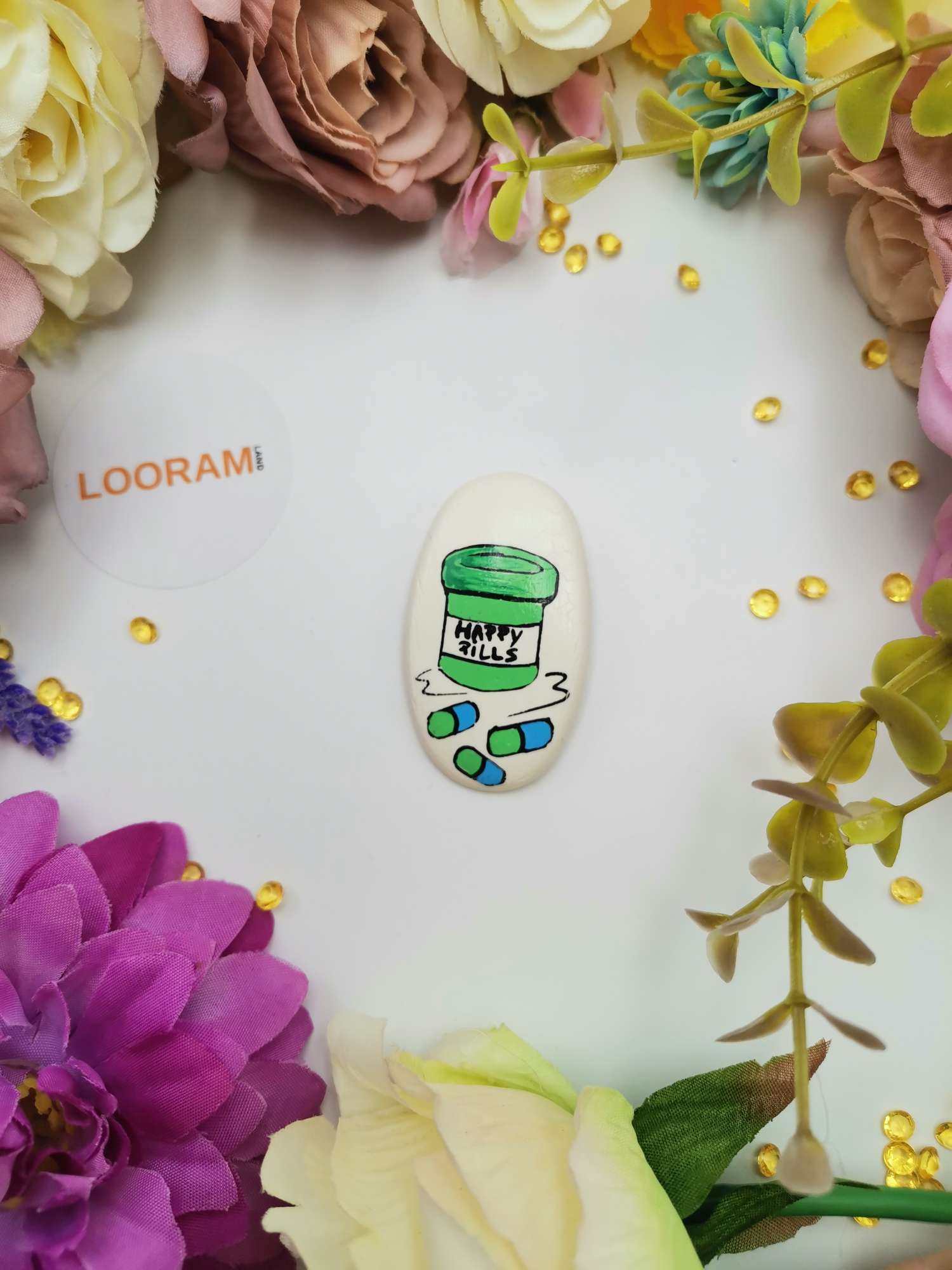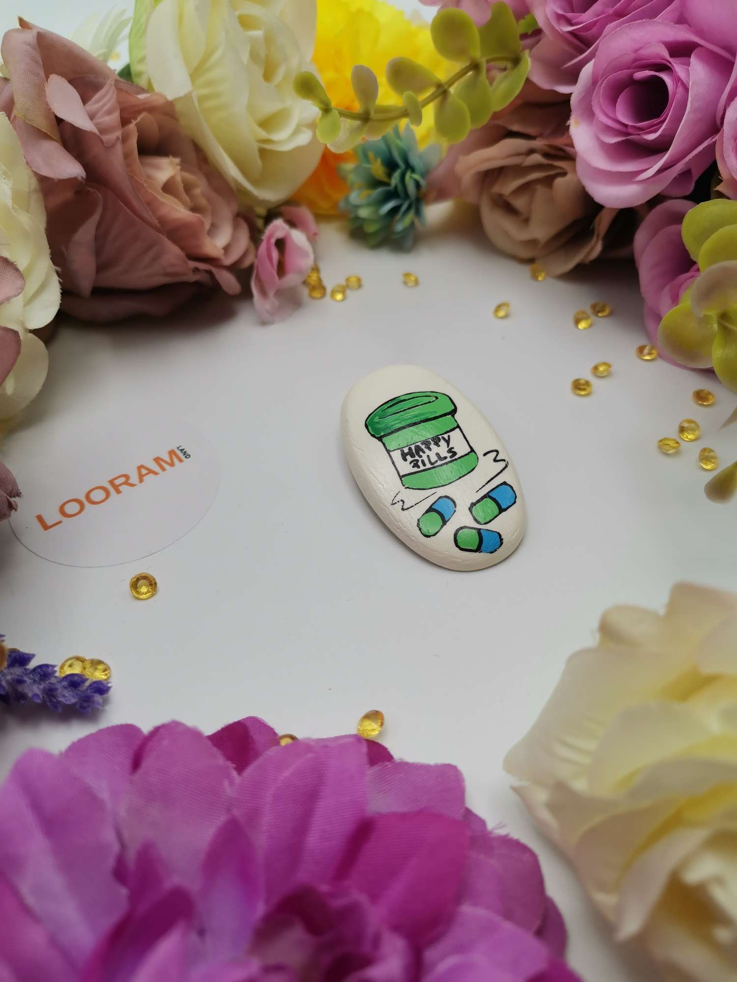Brosa model borcan cu pastile Happy Pills desenata in culori acrilice pe o baza din portelan rece.