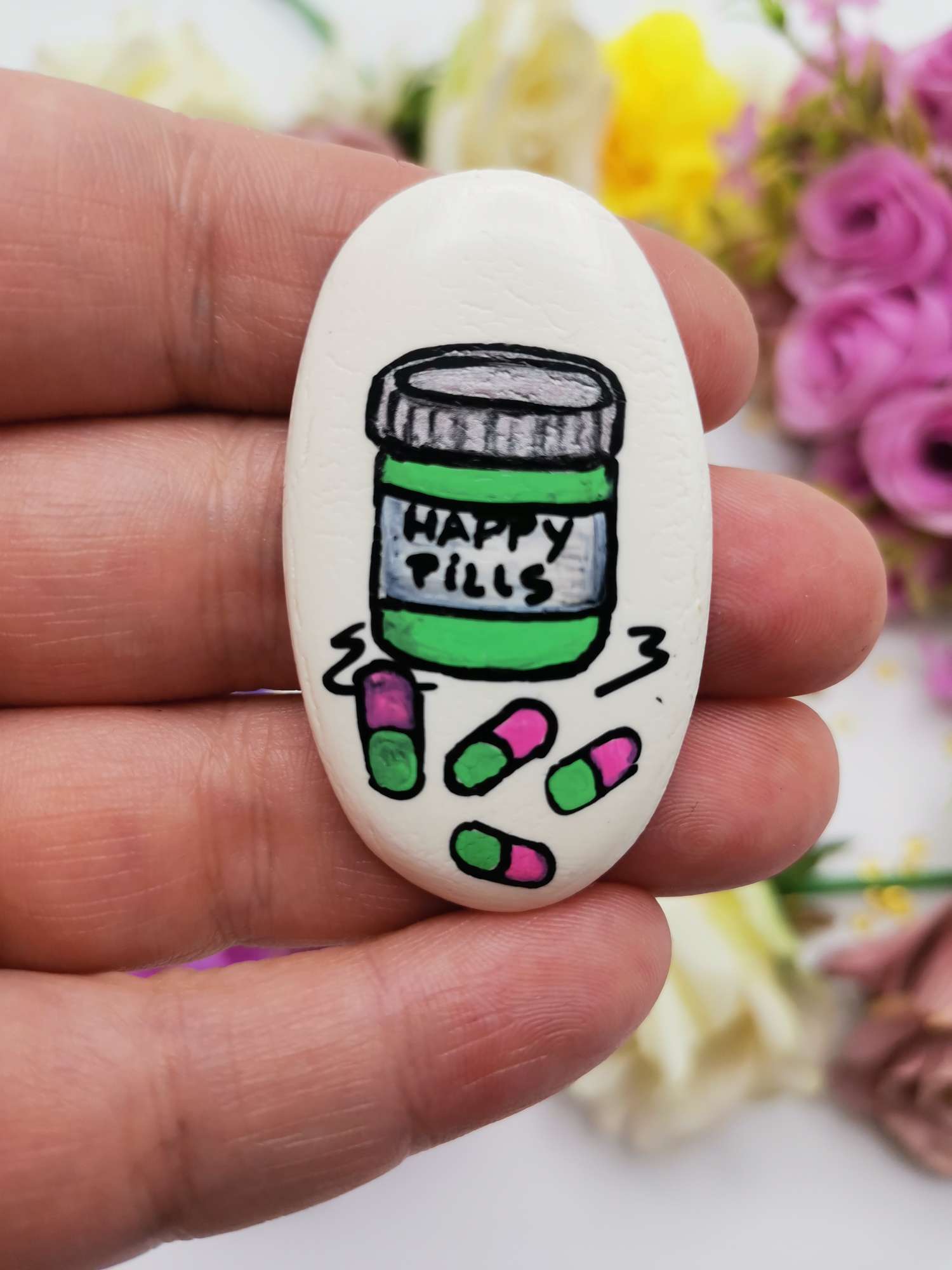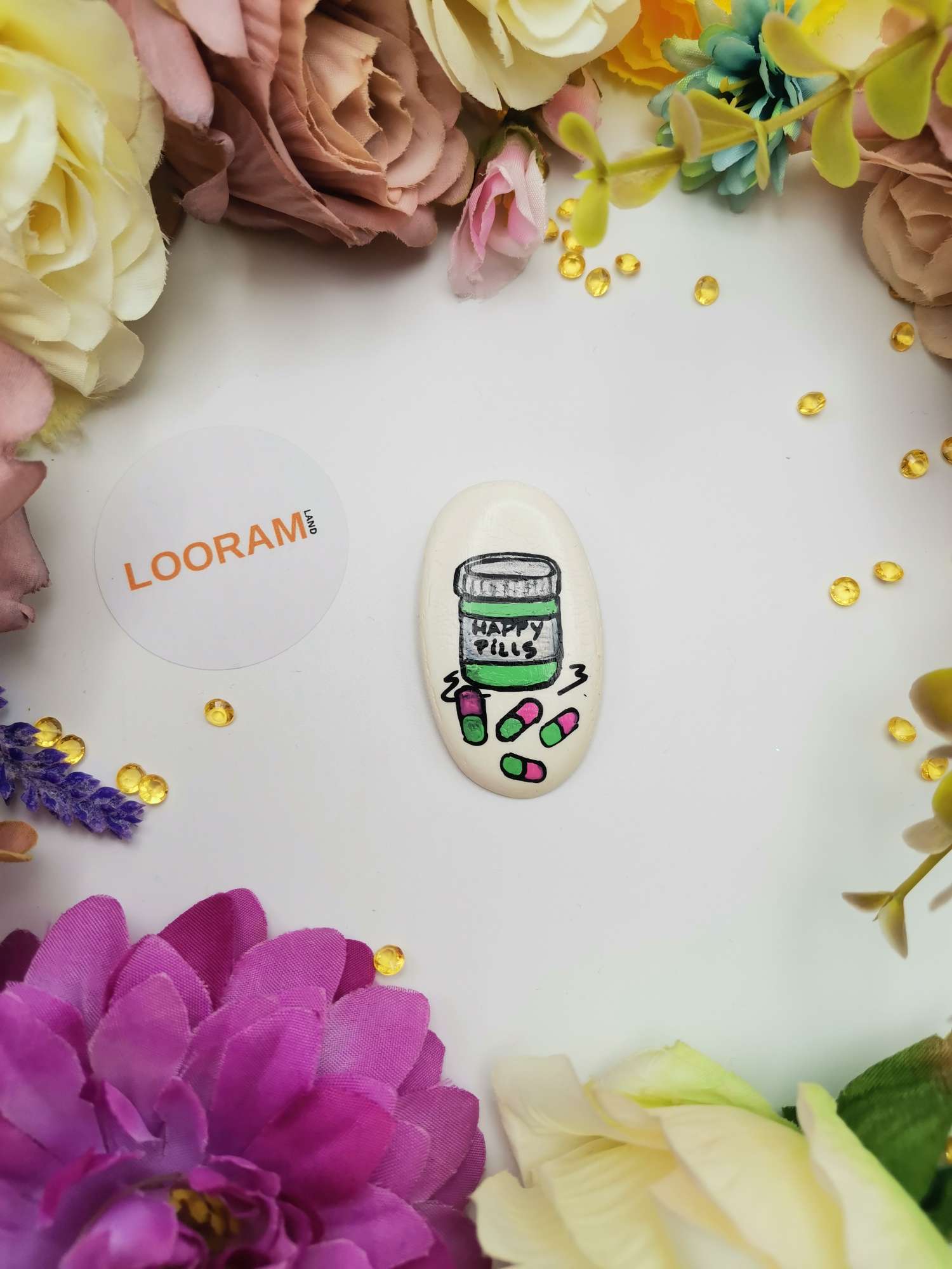 Brosa model borcan cu pastile Happy Pills desenata in culori acrilice pe o baza din portelan rece.