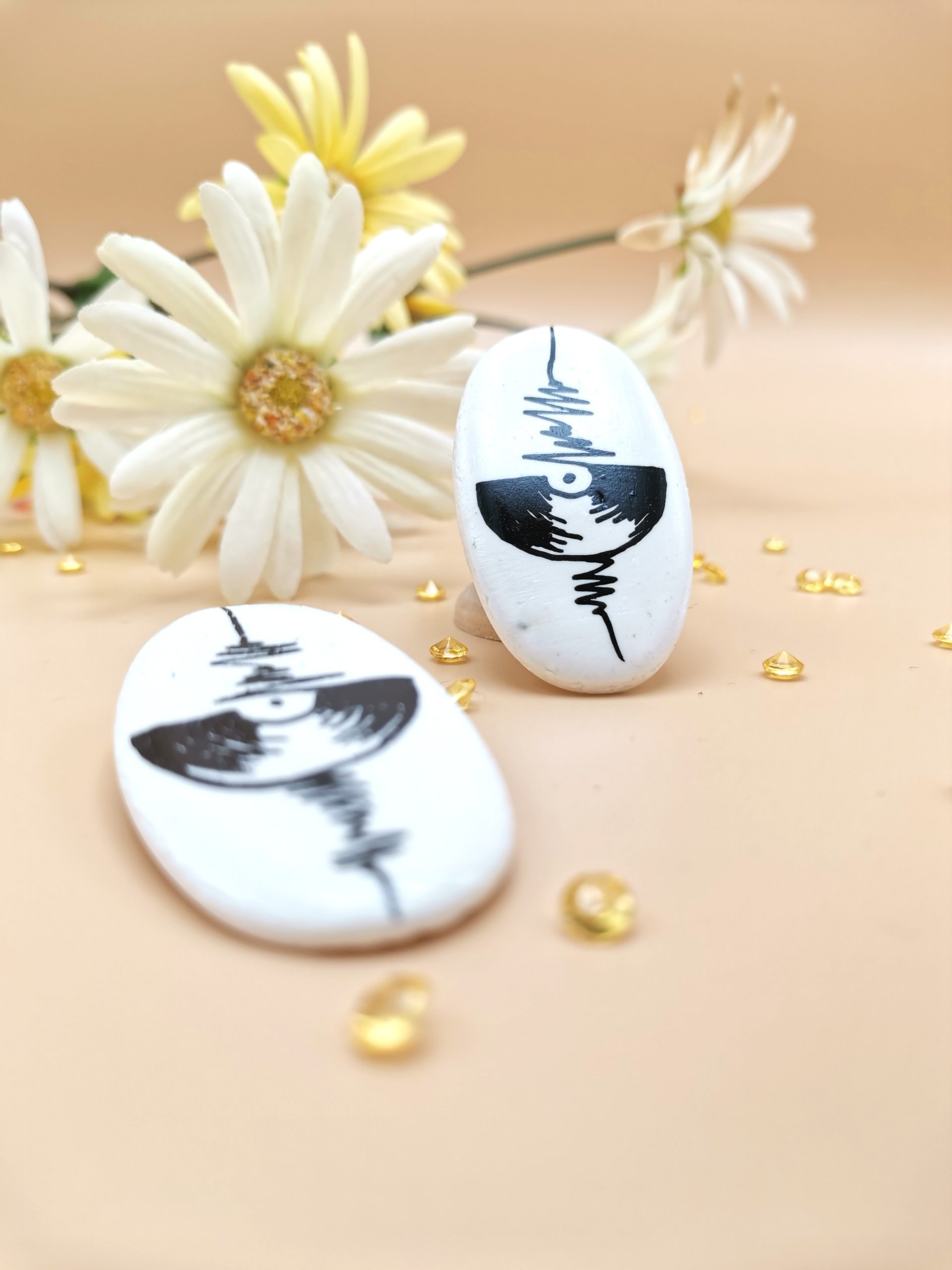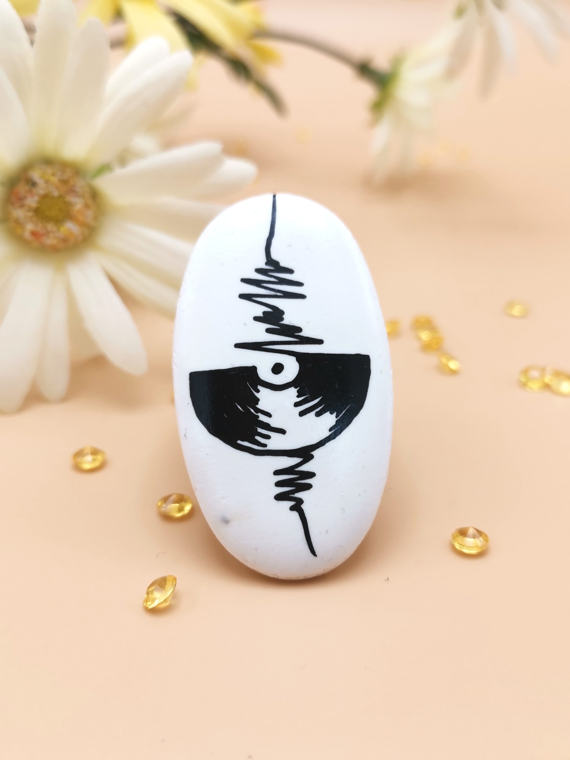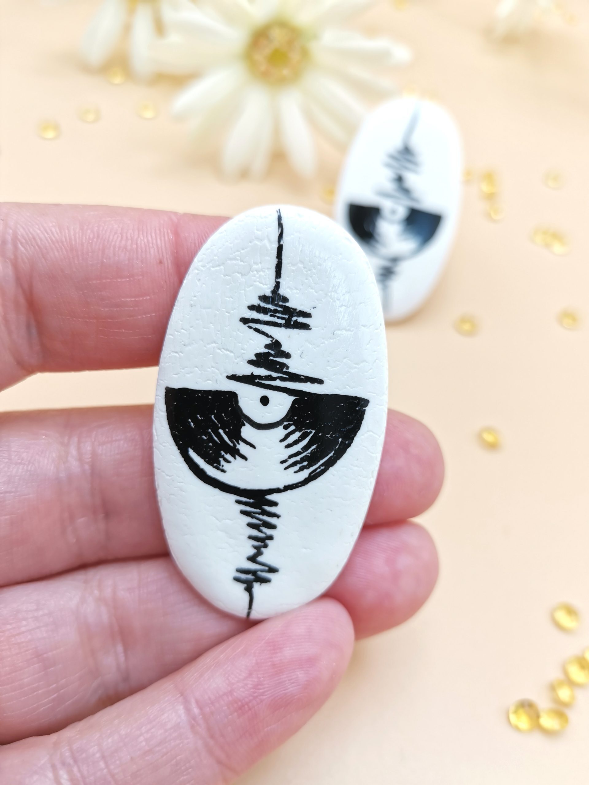 Brosa model Muzica – Disc si vibratii – desenata in culori acrilice pe o baza din portelan rece.