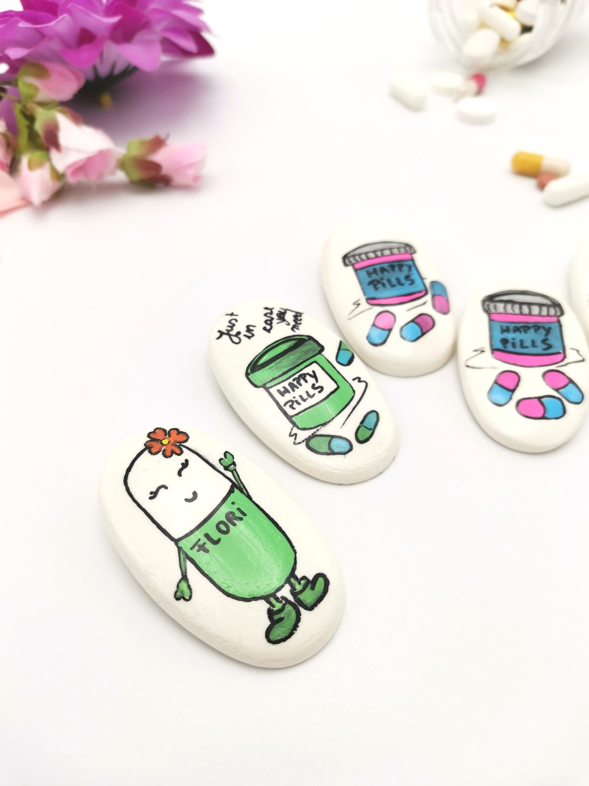 Brosa model Pastila cu nume ~Flori~ desenata in culori acrilice pe o baza din portelan rece.