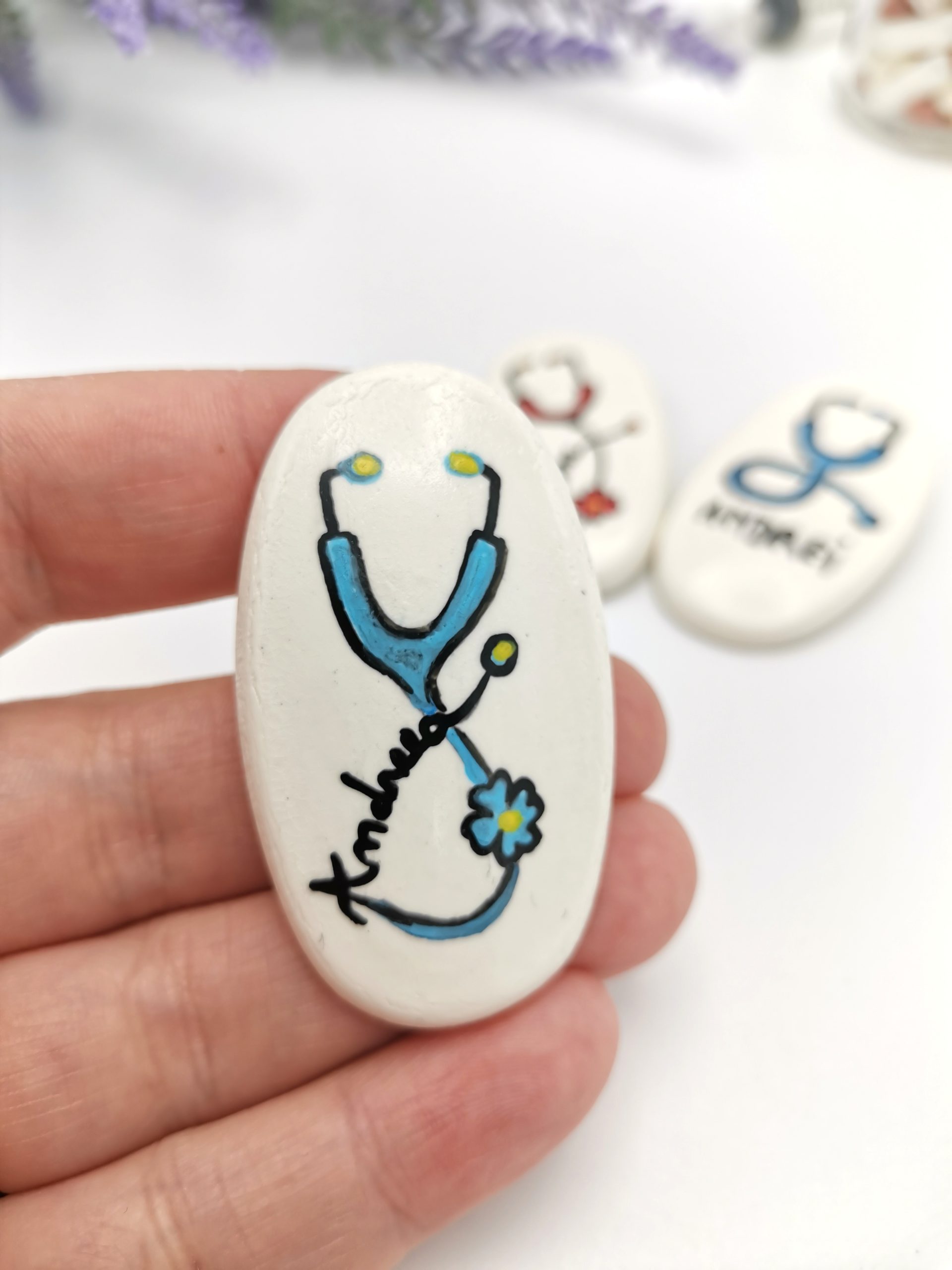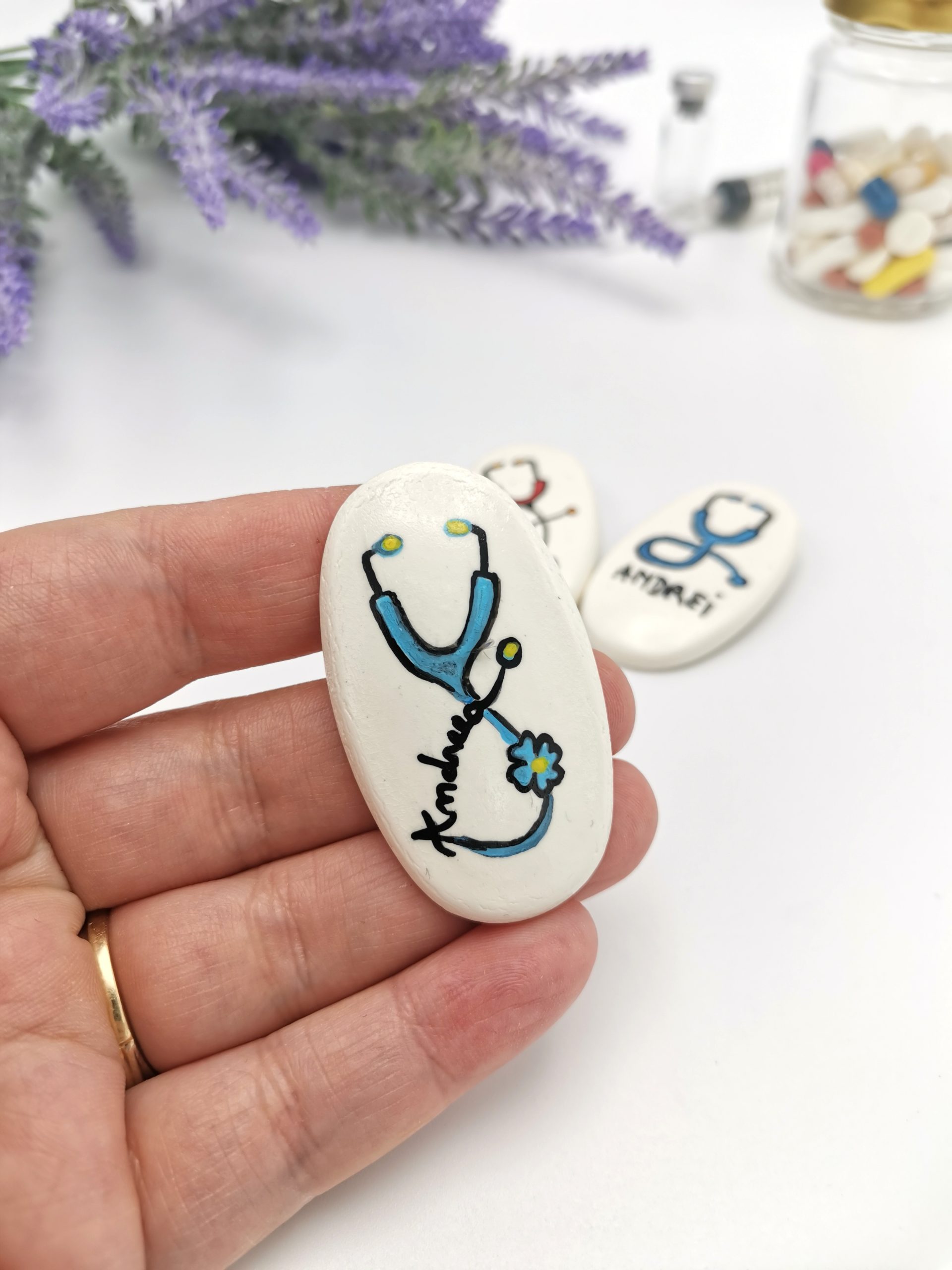 Brosa model Stetoscop cu nume ~Andreea~ desenata in culori acrilice pe o baza din portelan rece.