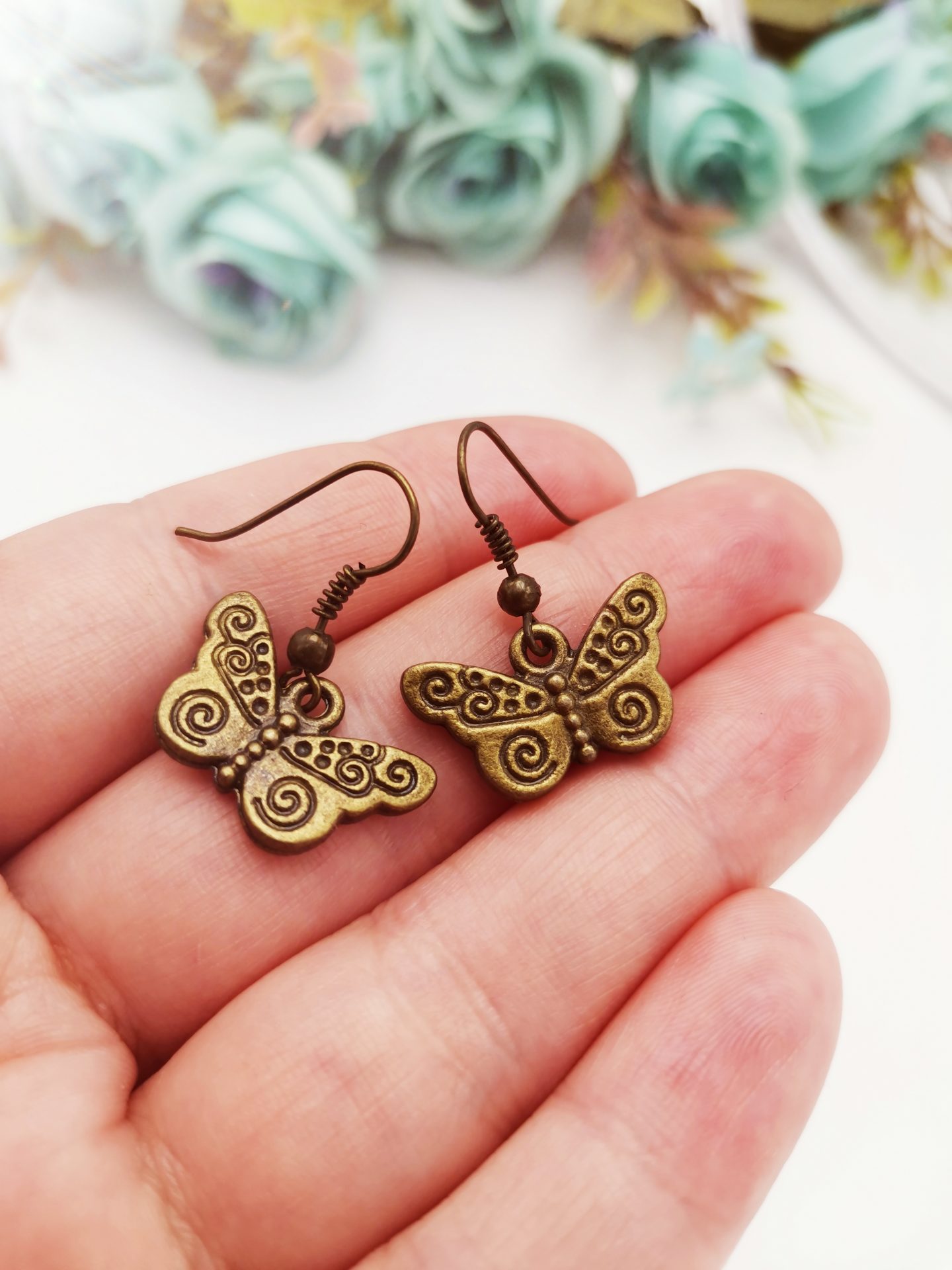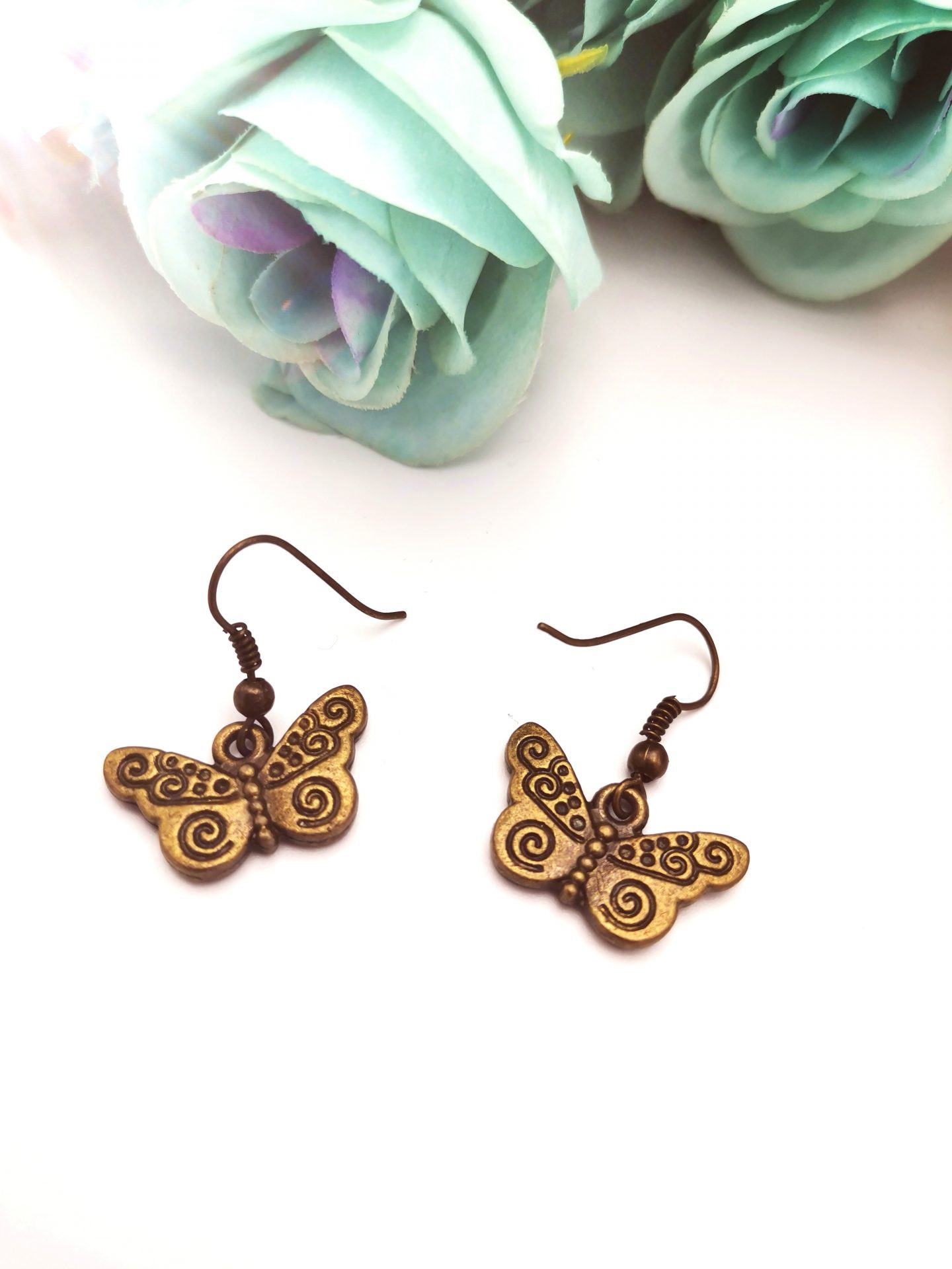 Cercei simpli, realizati cu tortite si accesorii in forma de fluturi in miniatura, în nuanțe de bronz.