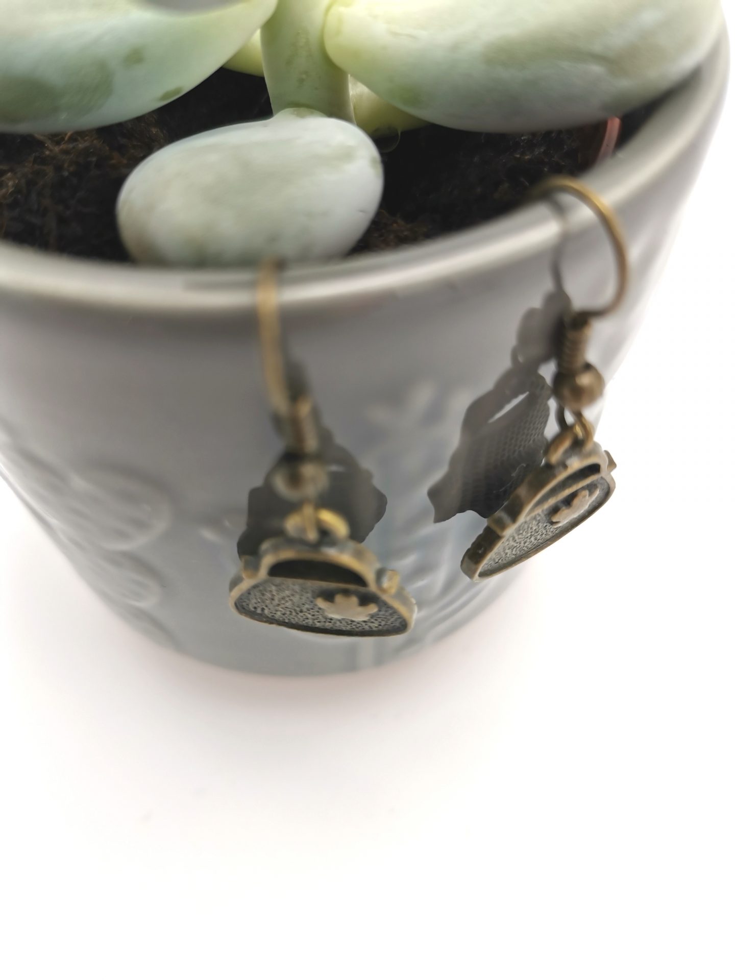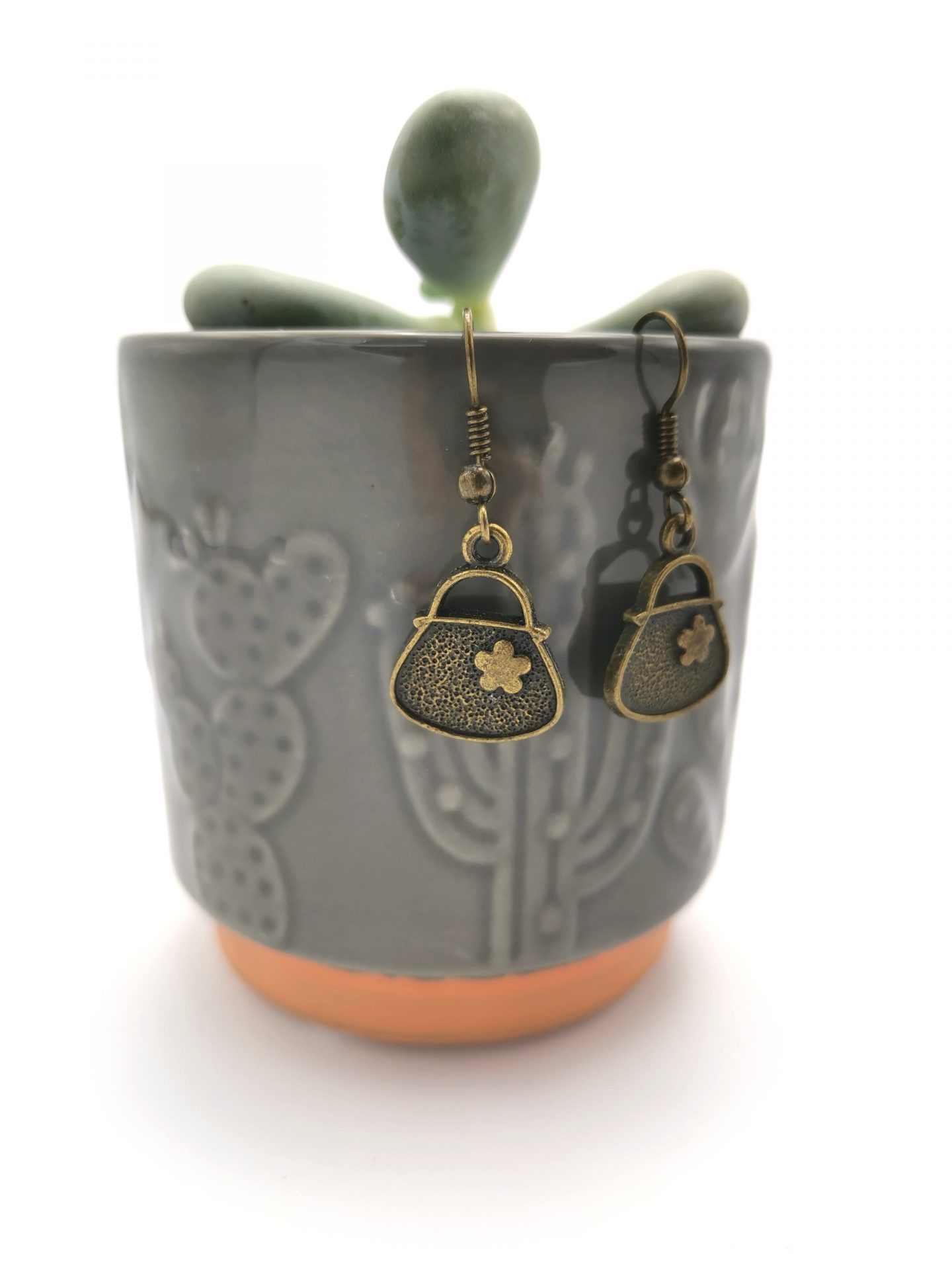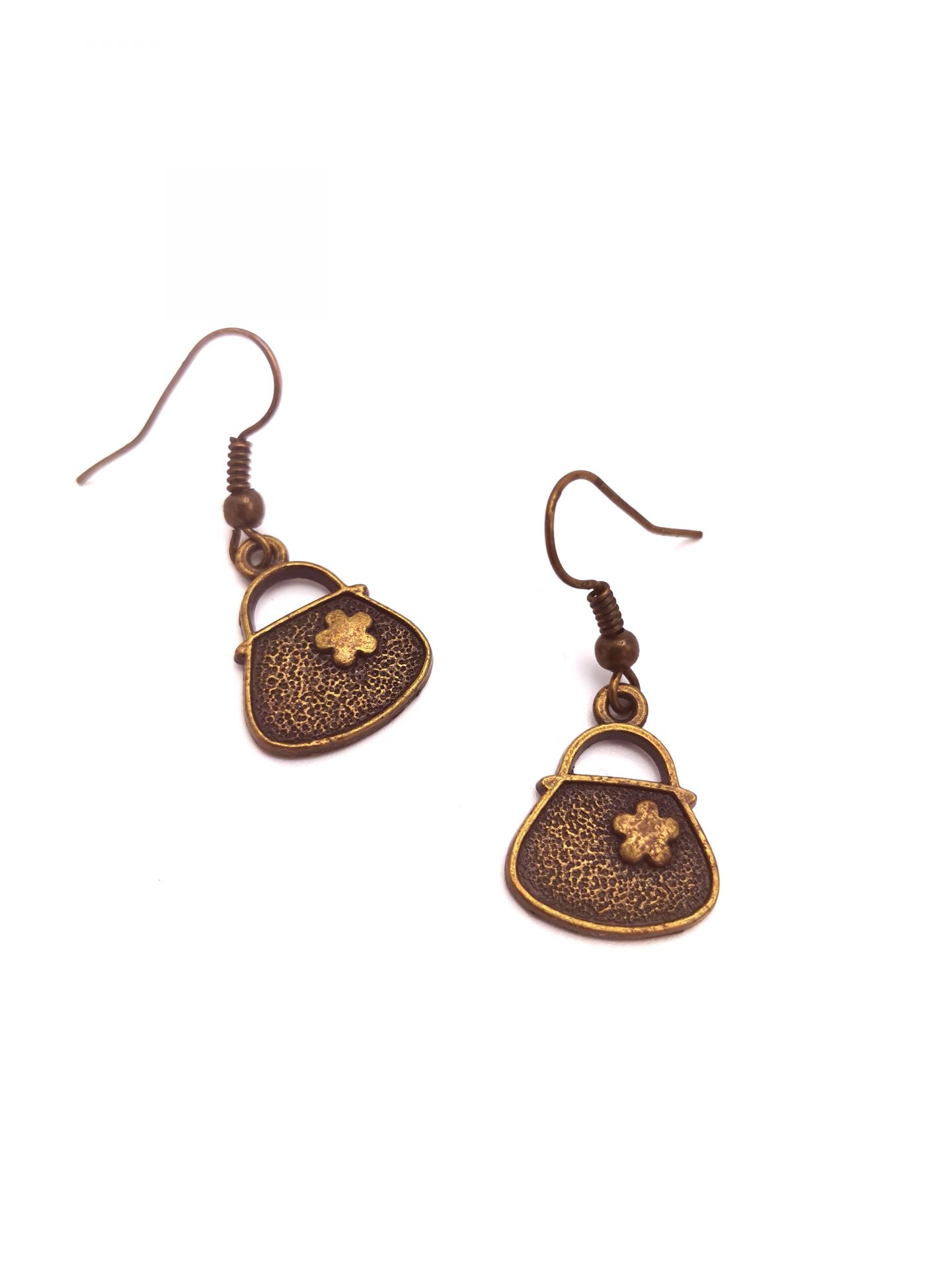 Cercei simpli, realizati cu tortite si accesorii in forma de gentuta, în nuanțe de bronz.