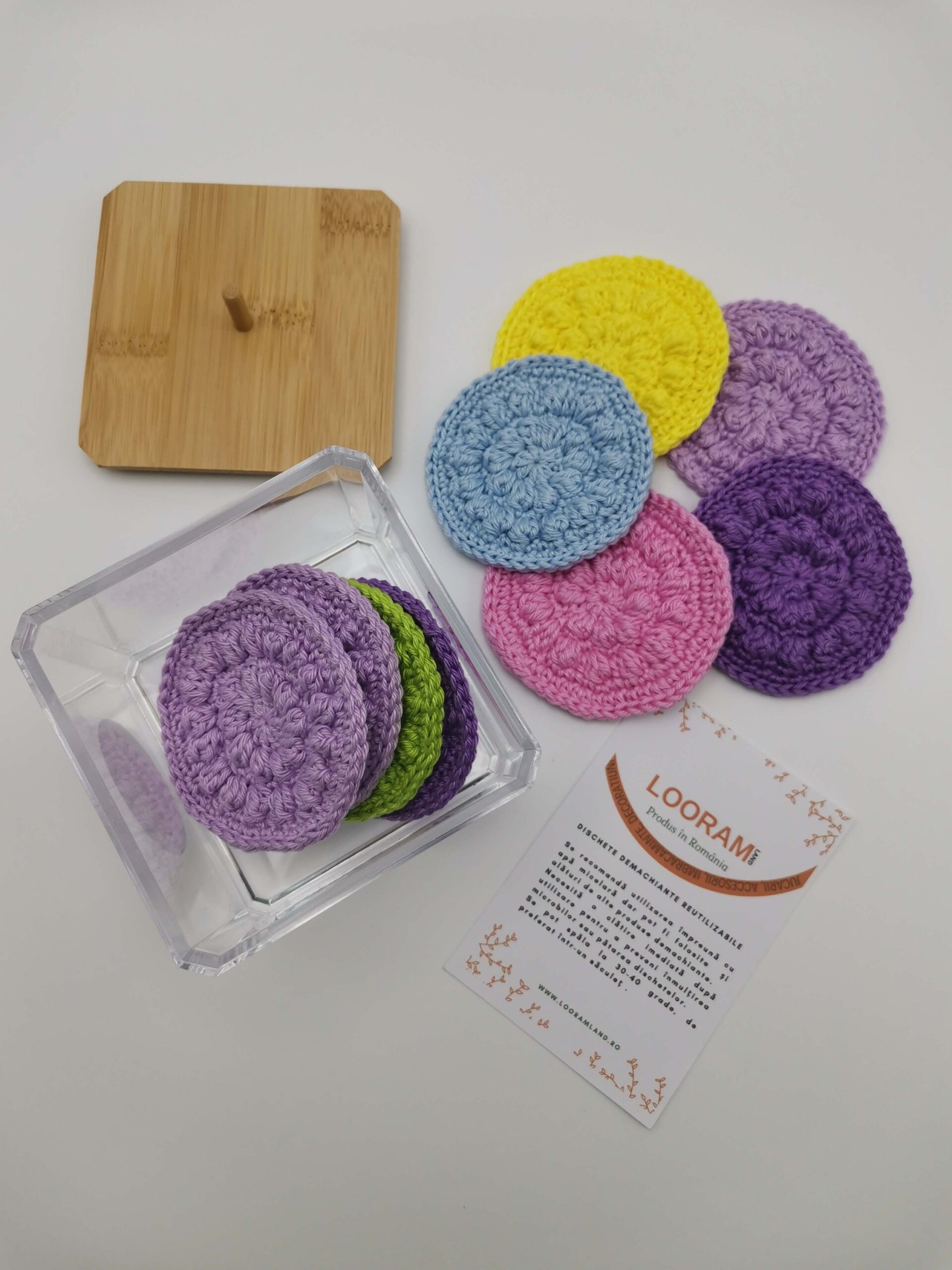 Dischetele sunt crosetate manual din bumbac 100 % si au un diametru de aproximativ 7 cm.