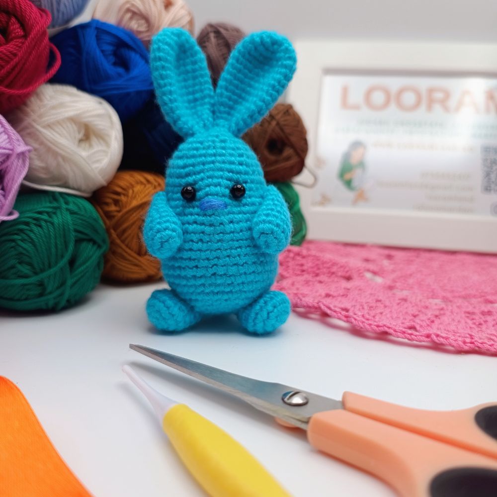 Jucarie handmade decorativa mini iepuras crosetat realizat manual din fire de acril, margelute din plastic cusute și umplutura siliconizata superball nonalergenica.
