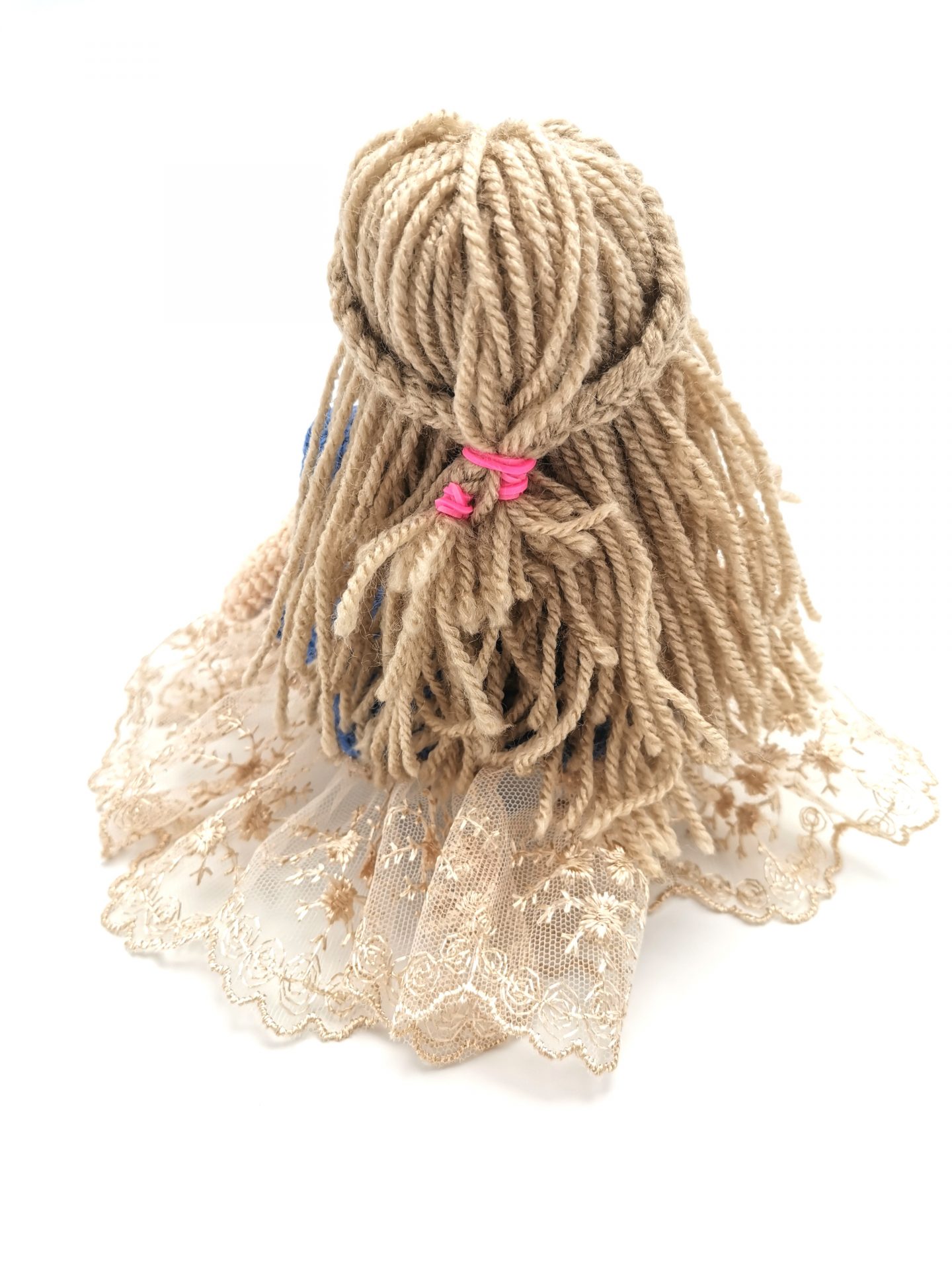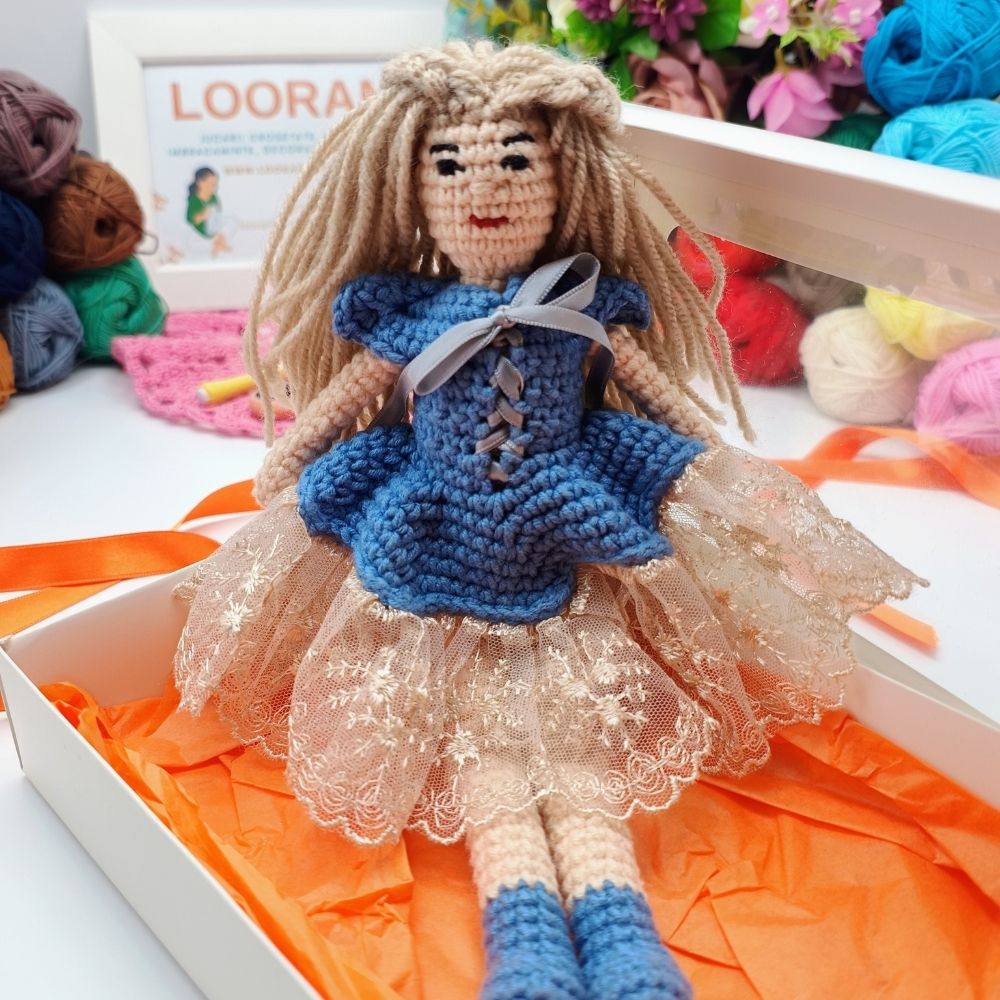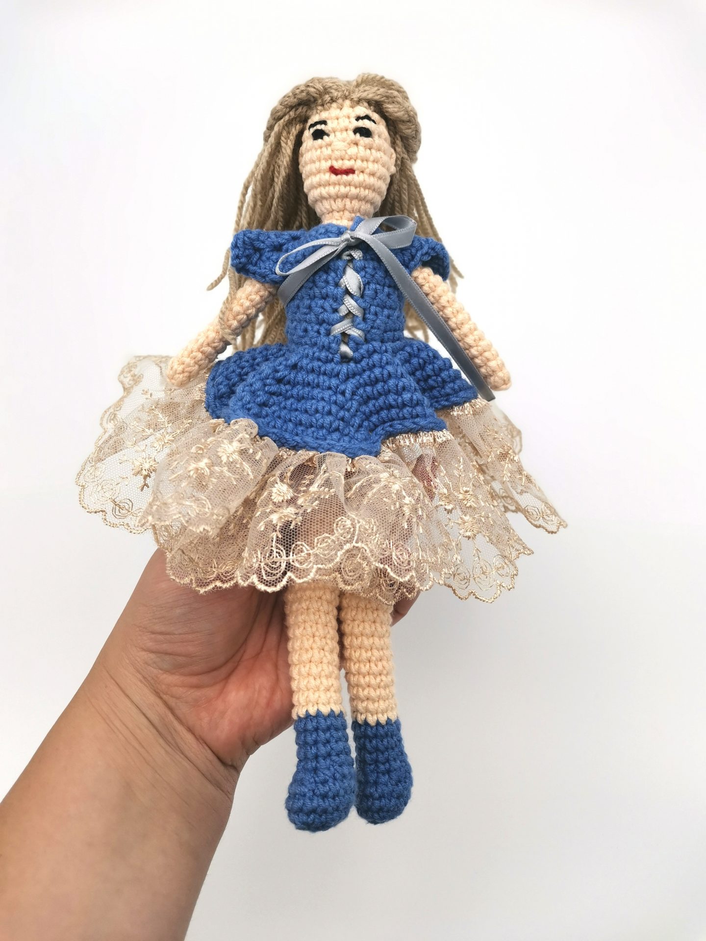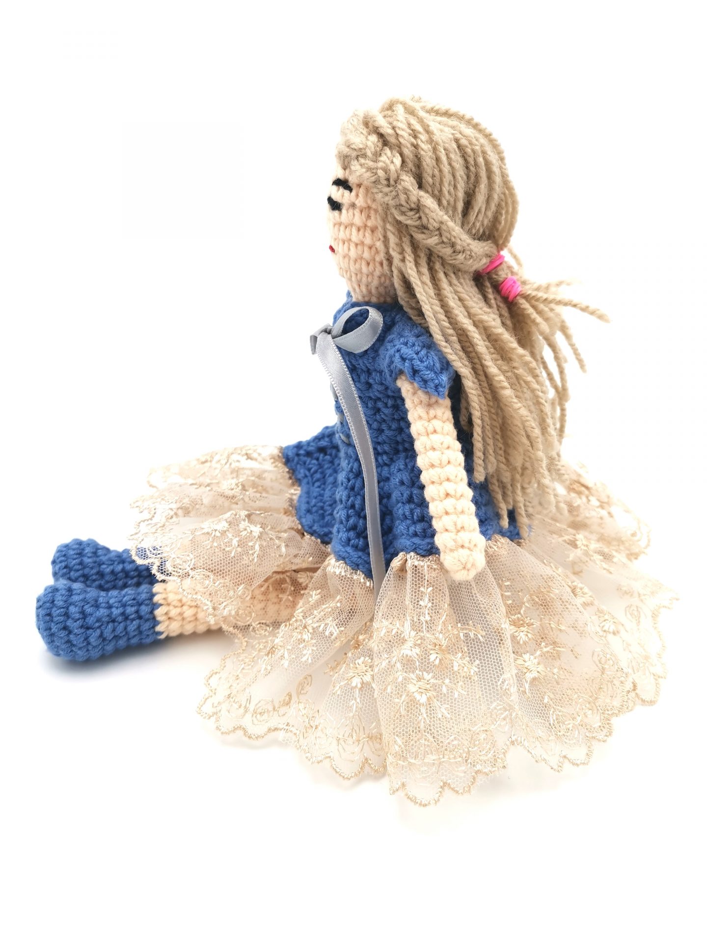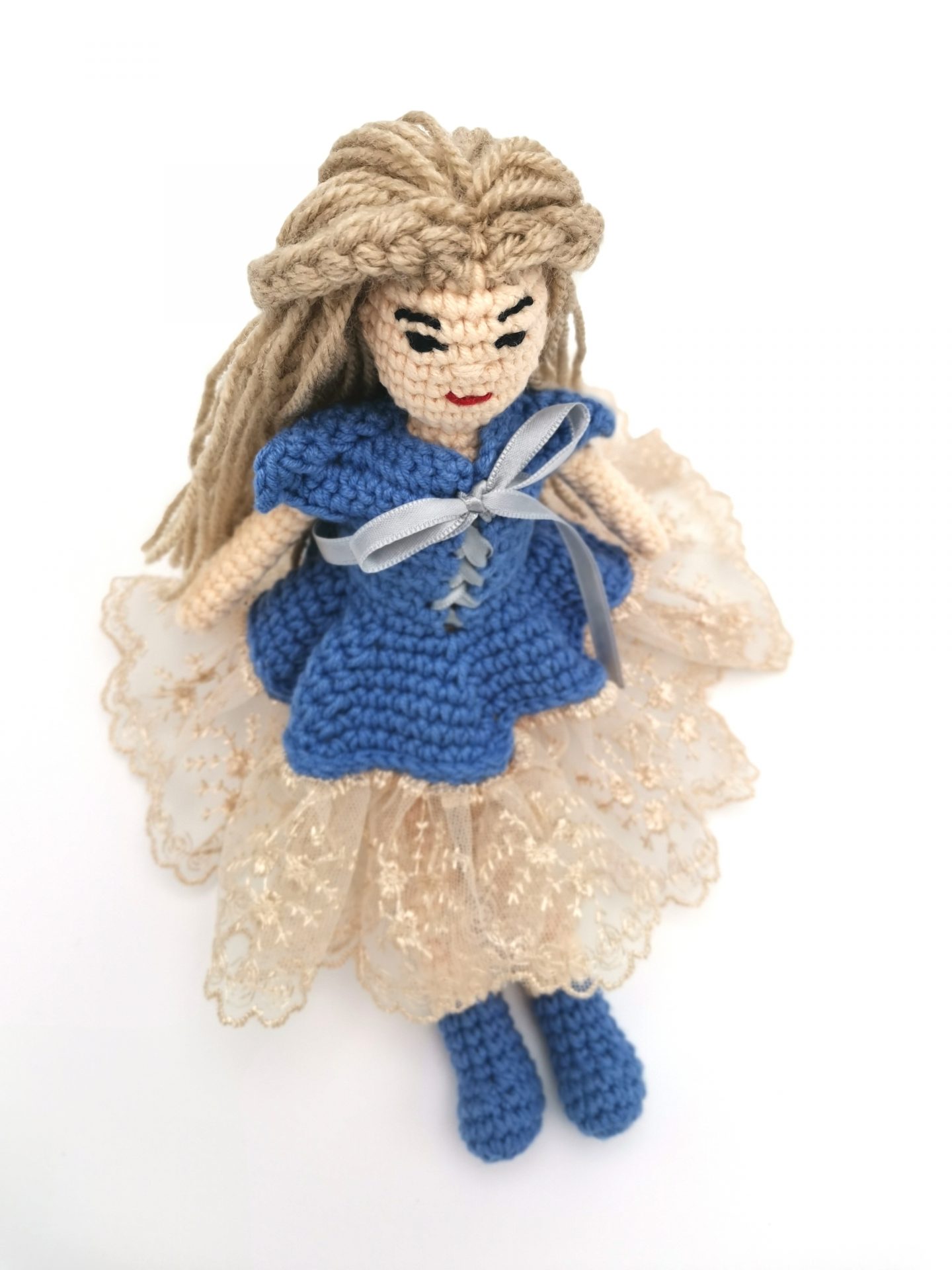 Toate elementele sunt crosetate si mai apoi atasate prin coasere in afara de rochita care se poate scoate deoarece este lucrata cu decolteu special pentru a putea fi detasata.