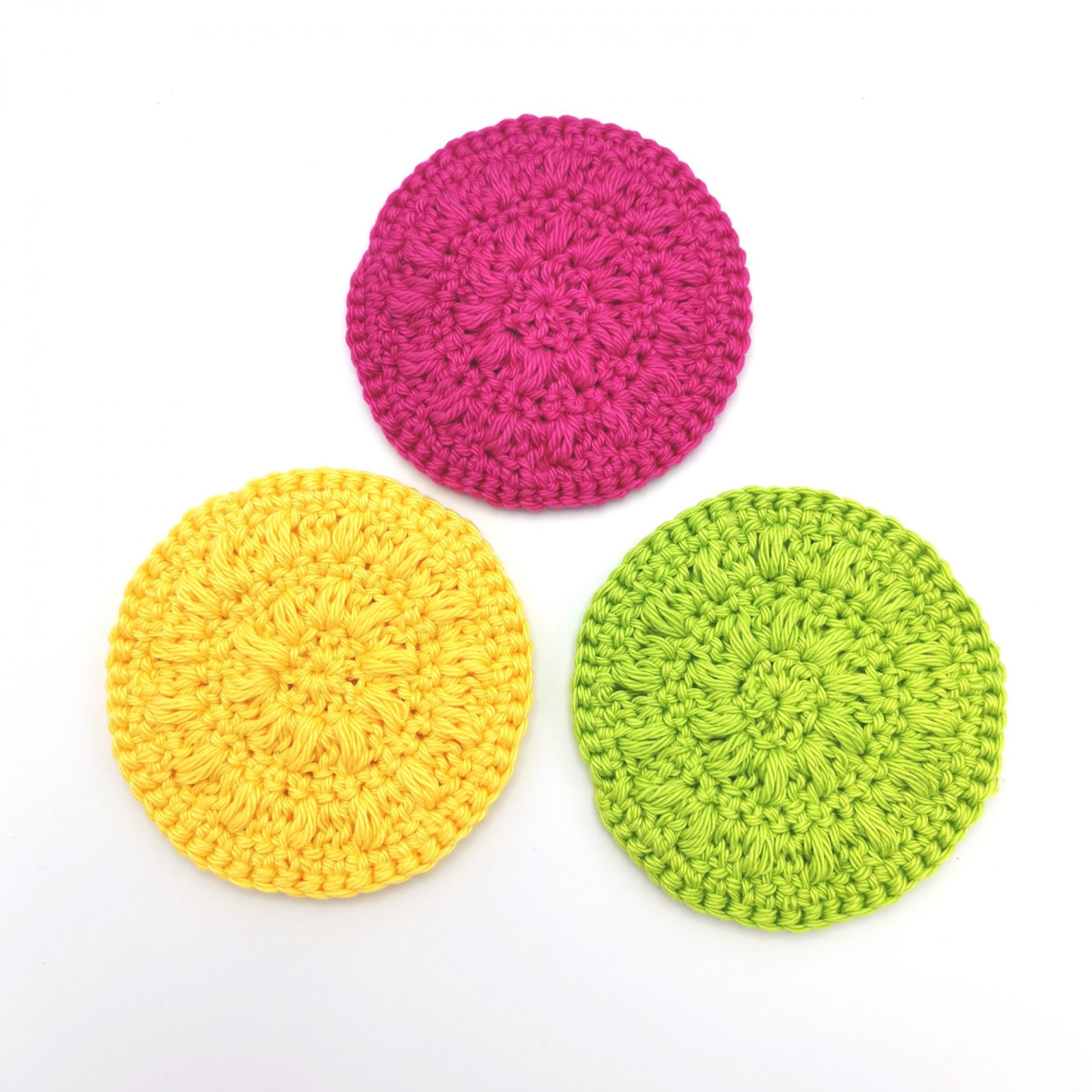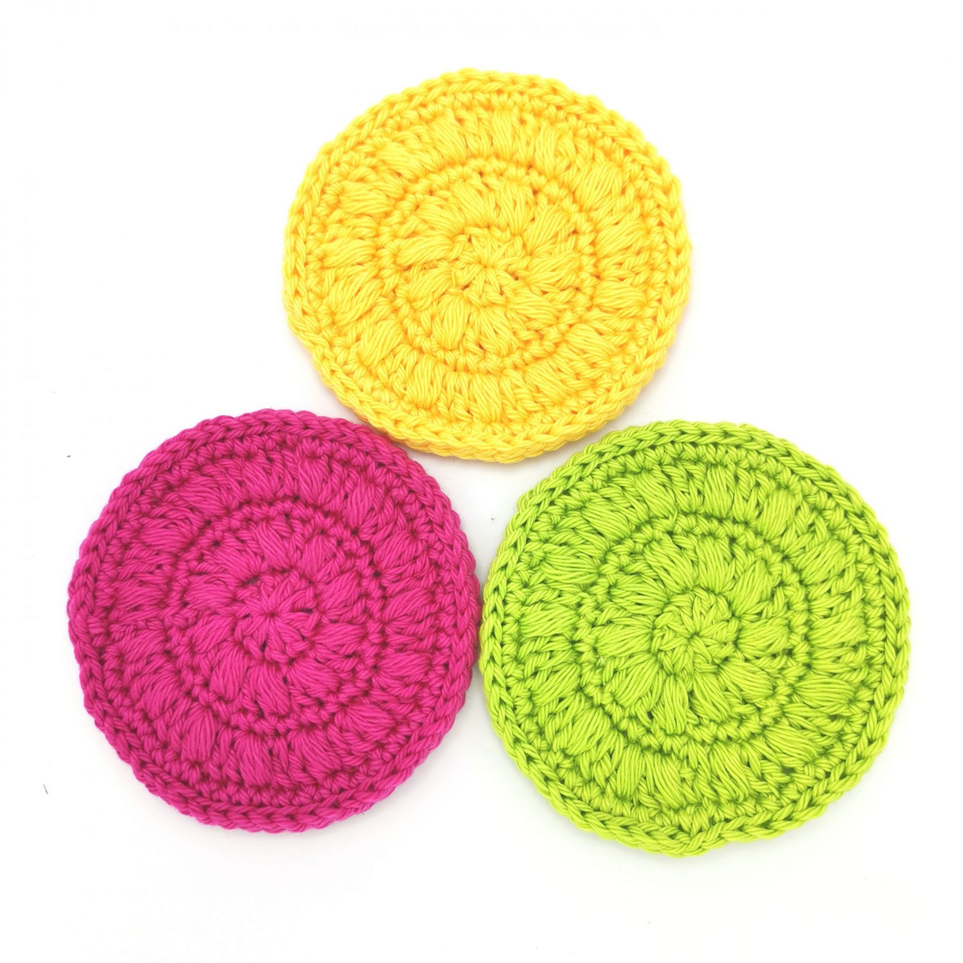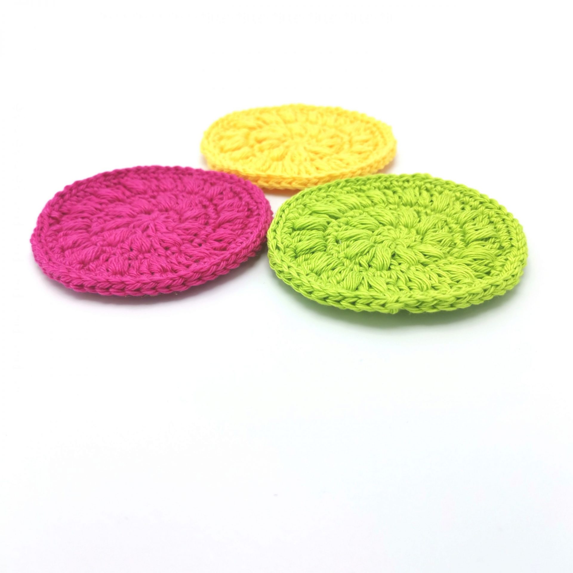 Dischetele sunt crosetate manual din bumbac 100 % si au un diametru de aproximativ 7 cm.