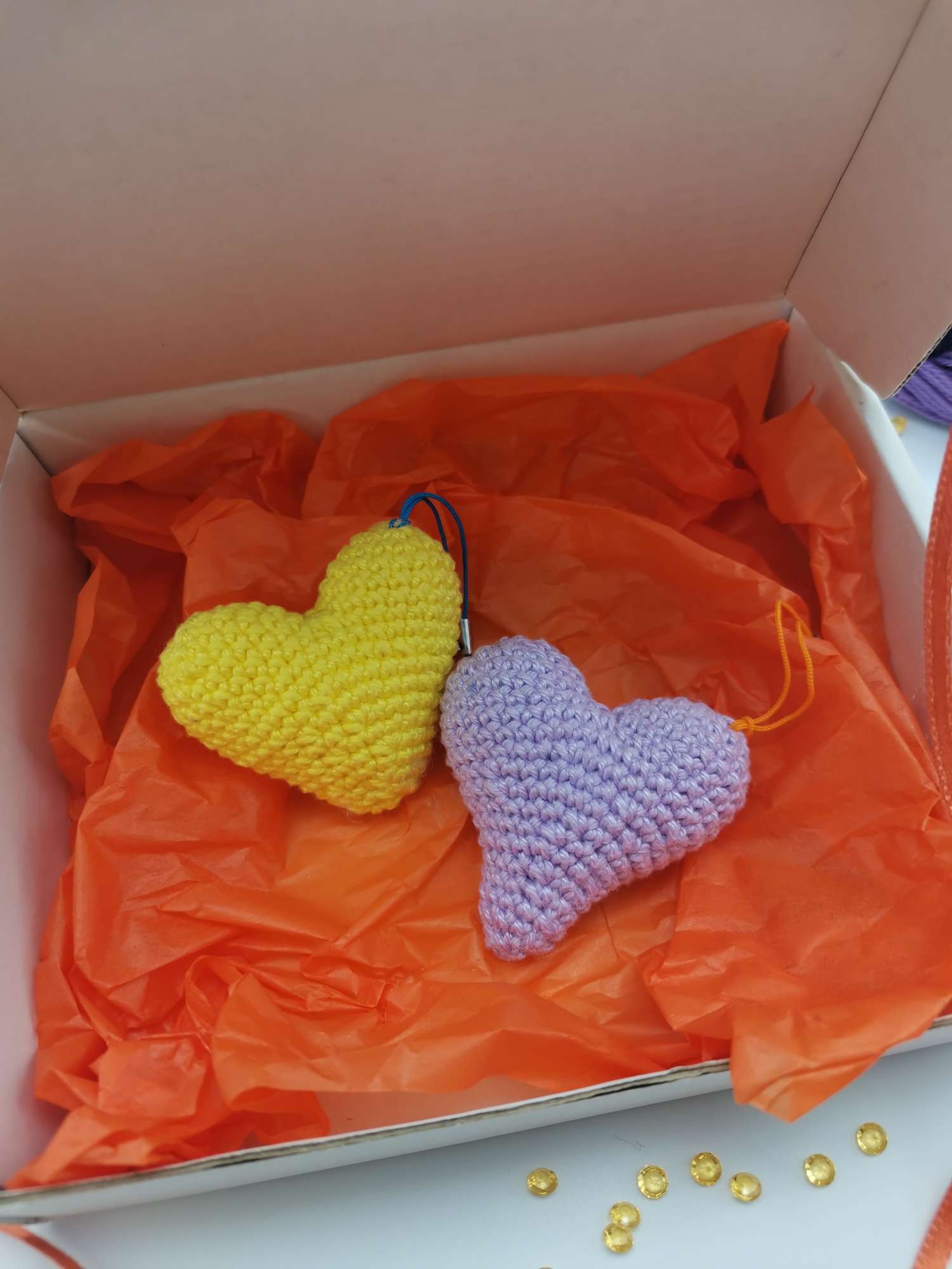Set doua brelocuri crosetate inimi. Setul contine 2 brelocuri. Unul galben si altul mov-lila