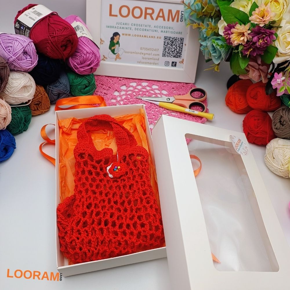 Traistă Croșetată Manuală – Model Unic cu Breloc Drăgălaș – Ambalată în Cutie Cadou