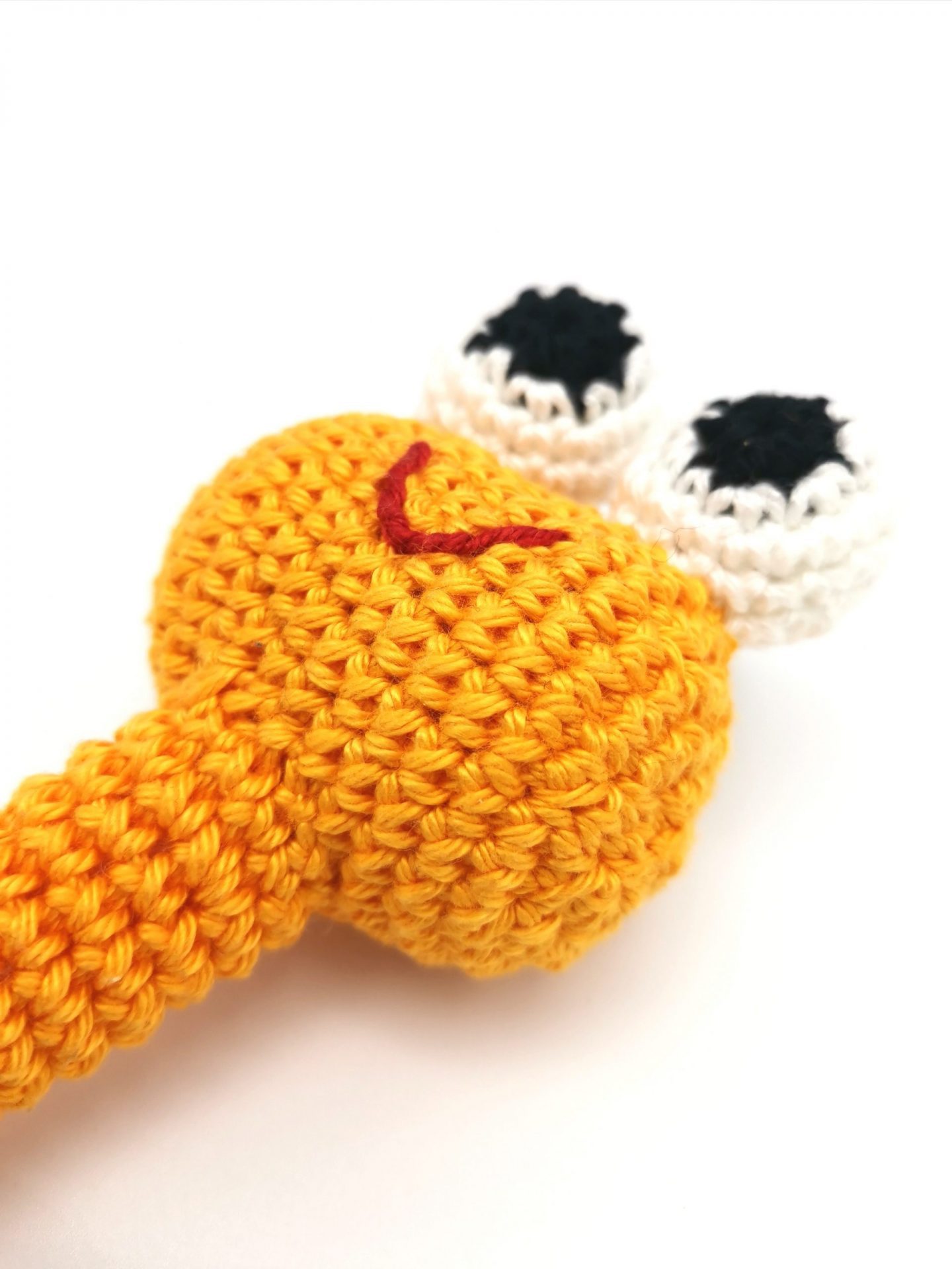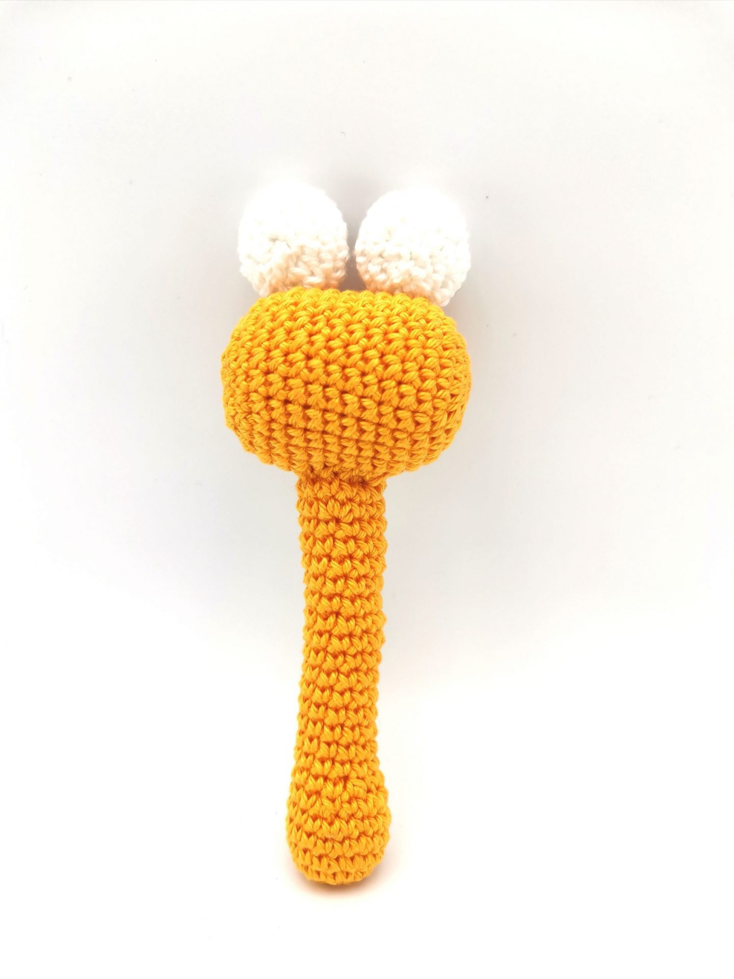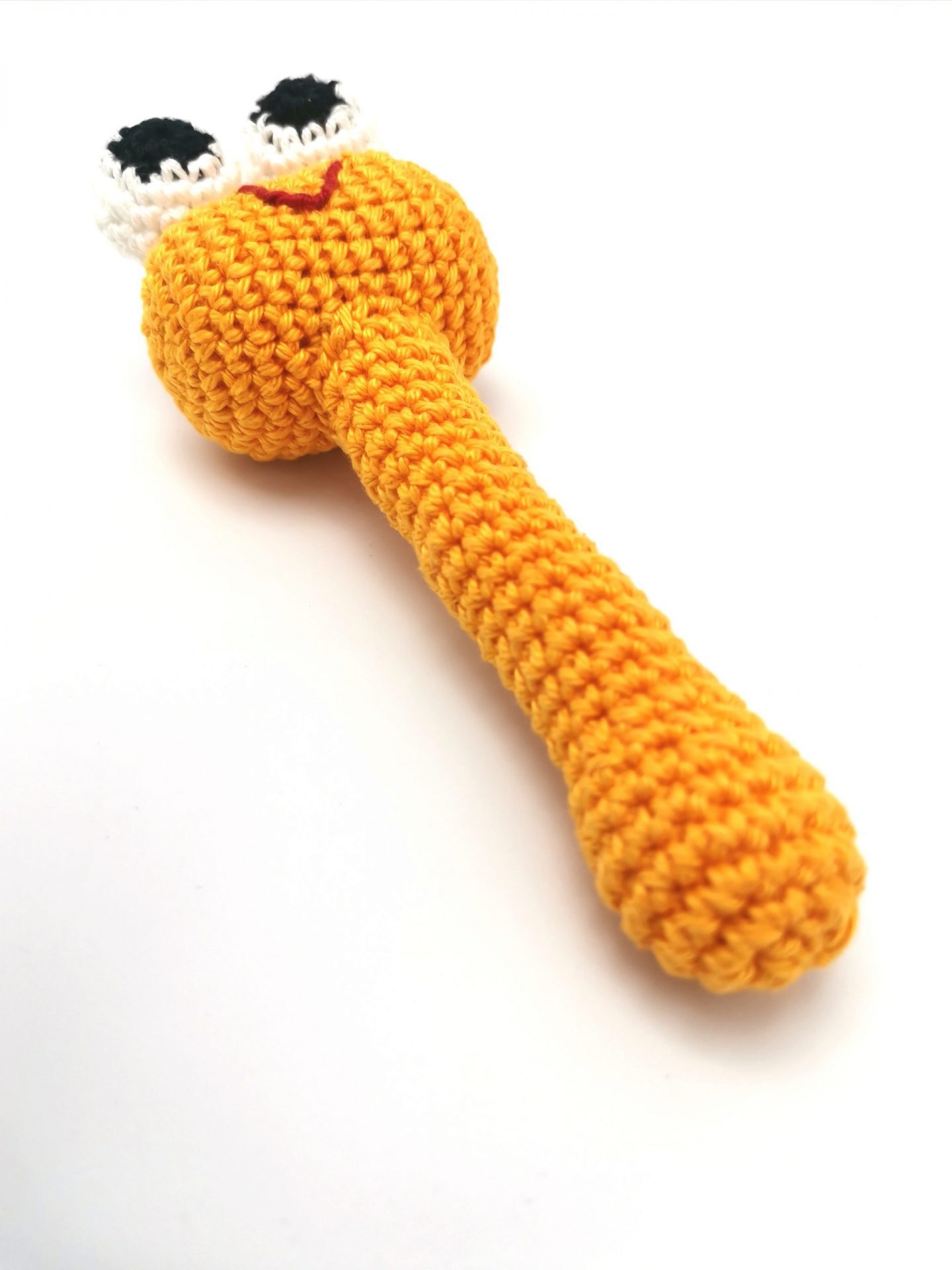 Jucarie cu element zornaitor, bumbac si umplutura superball. Ochii mari sunt numai buni de rontait. Acestia sunt cusuti de restul jucariei. Poate fi ciocanelul preferat al unui copil datorita zgomotului produs, un sunet care nu este deloc deranjant, fiind sunetul unor margelute ce se misca intr-un ou kinder sigilat. Jucaria se realizeaza pe baza de comanda, in culorile dorite. Pretul este pentru o jucarie de aproximativ 15 cm inaltime.